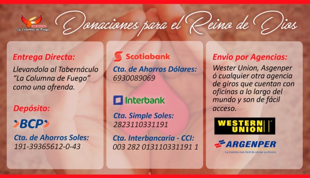 Luego de realizar tu envío, es importante que nos hagas llegar por email: johnnyhector@hotmail.com el número clave o código que te darán en la oficina de giros, así como la suma que has donado, solo así podremos hacer efectiva tu Ofrenda Voluntaria.